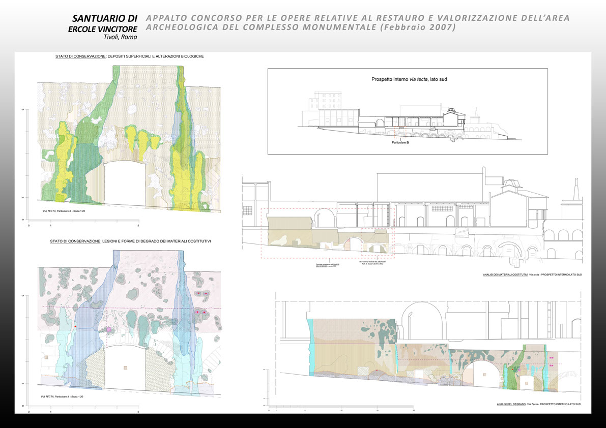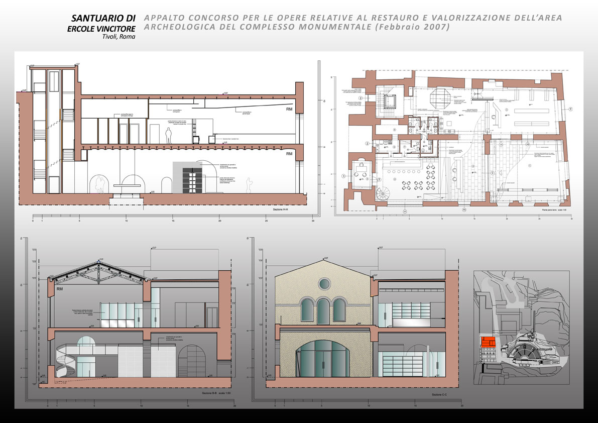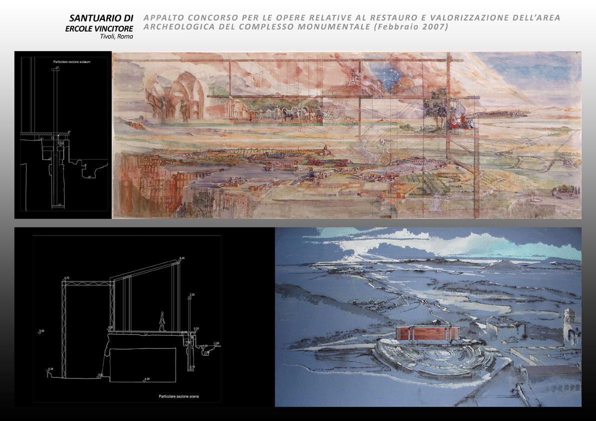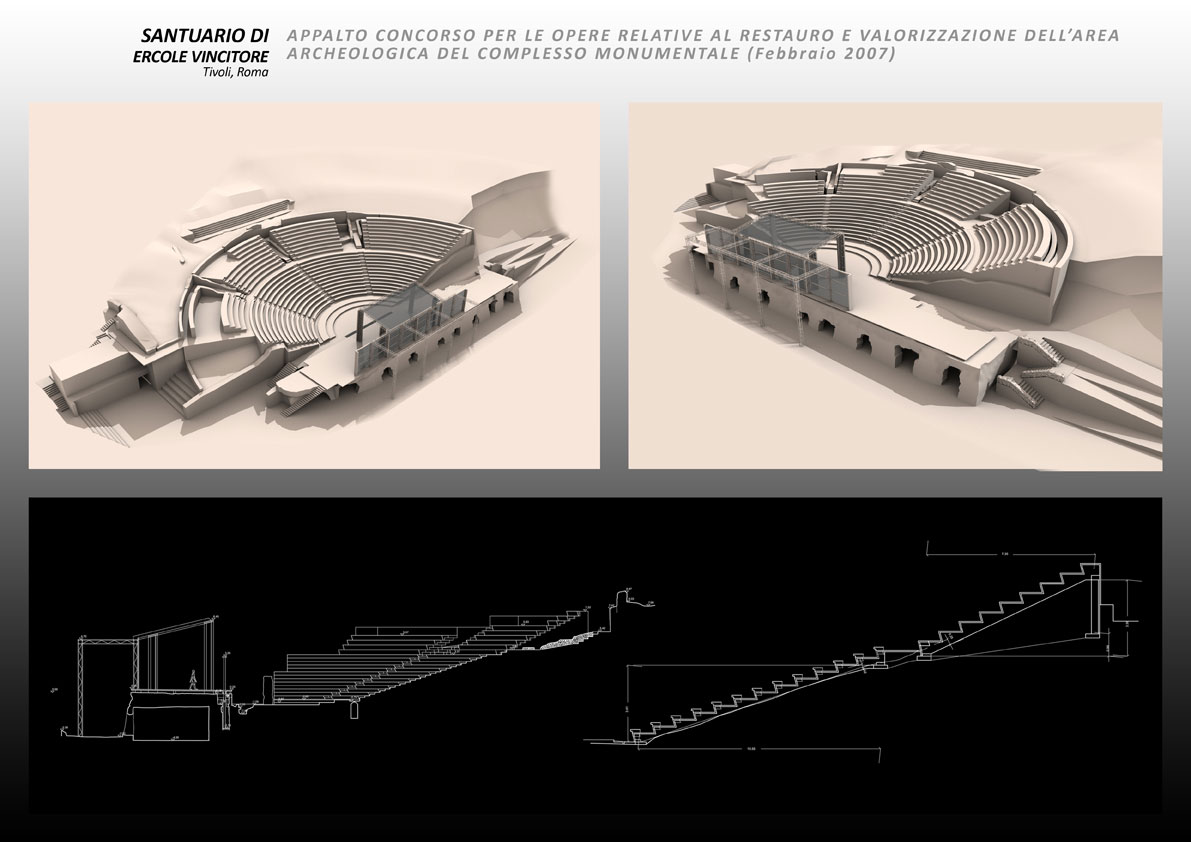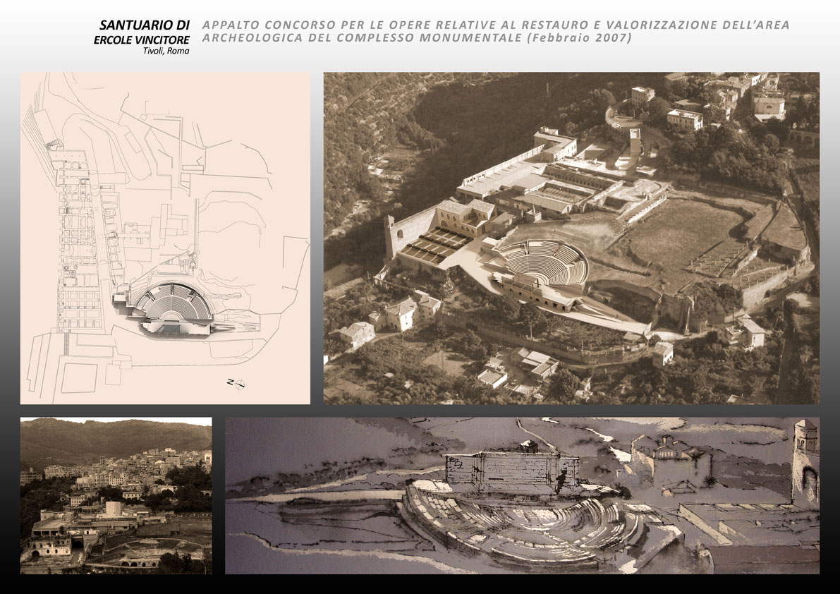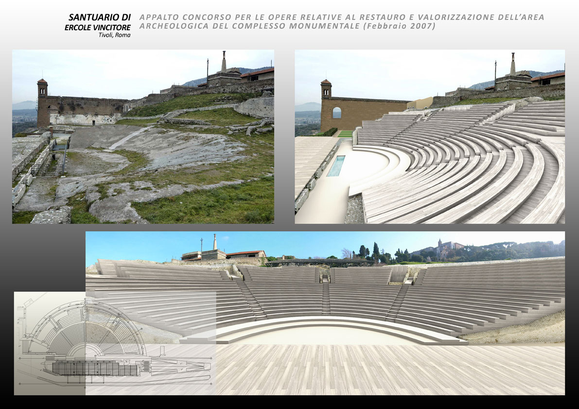 Agli inizi del 2007 la Direzione Generale Beni Culturali del Lazio, bandisce un appalto concorso per la valorizzazione del Santuario. Il restauro e la riapertura al pubblico del Santuario di Ercole avvia un’operazione virtuosa, suscettibile di riannodare, in un insieme organico e dotato di senso, l’attuale dispersione e frammentazione di uno dei più importanti complessi urbani antichi e medievali dell’Italia centrale. La proposta si focalizza nella riconfigurazione delle cavea, nella restituzione all’uso della scena e nella ridefinizione del sistema d’accesso e dei servizi, perché il santuario torni a vivere nella nuova veste di un polo culturale tra musealizzazione e spettacolo.   Opere comprese nella proposta: interventi di carattere strutturale, di consolidamento e di miglioramento sismico; interventi di riconfigurazione architettonica; lavori si sistemazione dell’area ed allestimento dei percorsi; realizzazione dei servizi di accoglienza per i visitatori; interventi di restauro archeologico; impianti