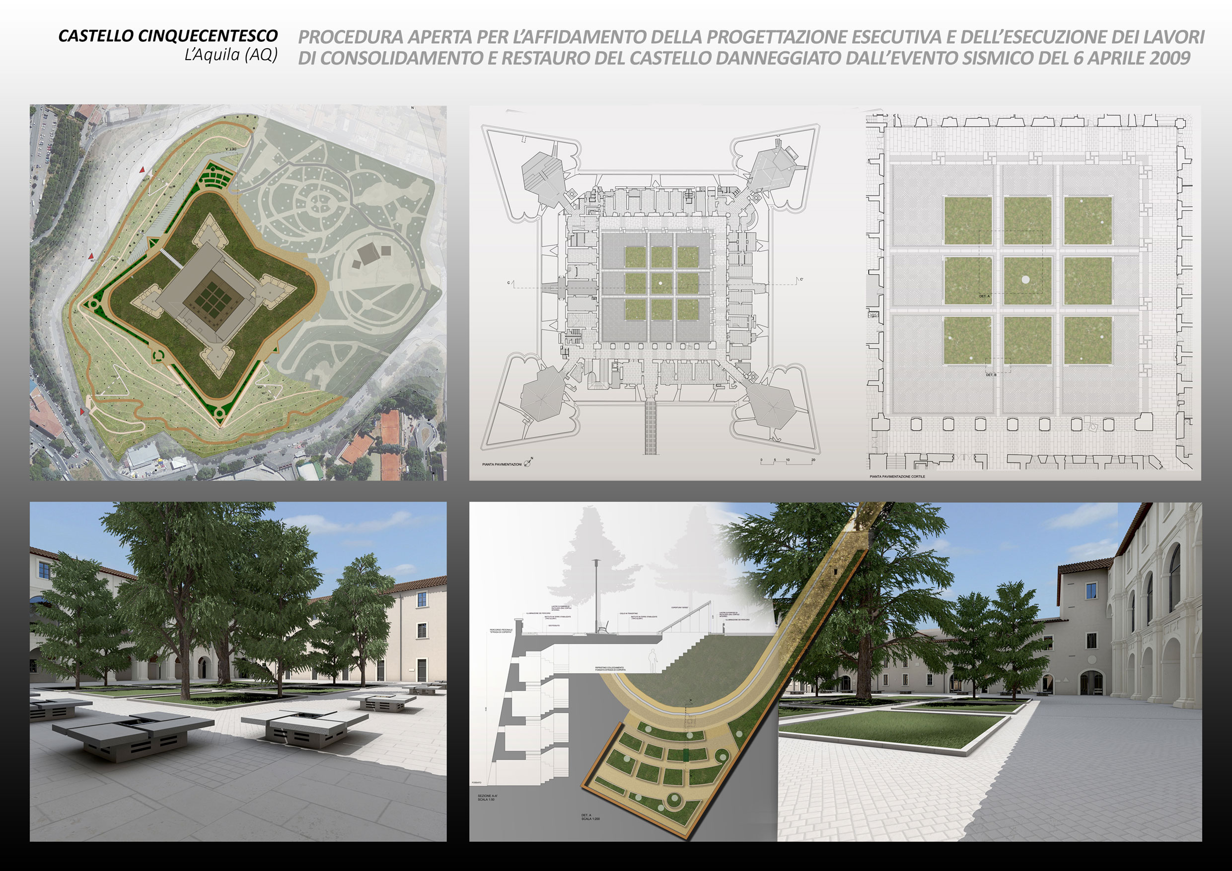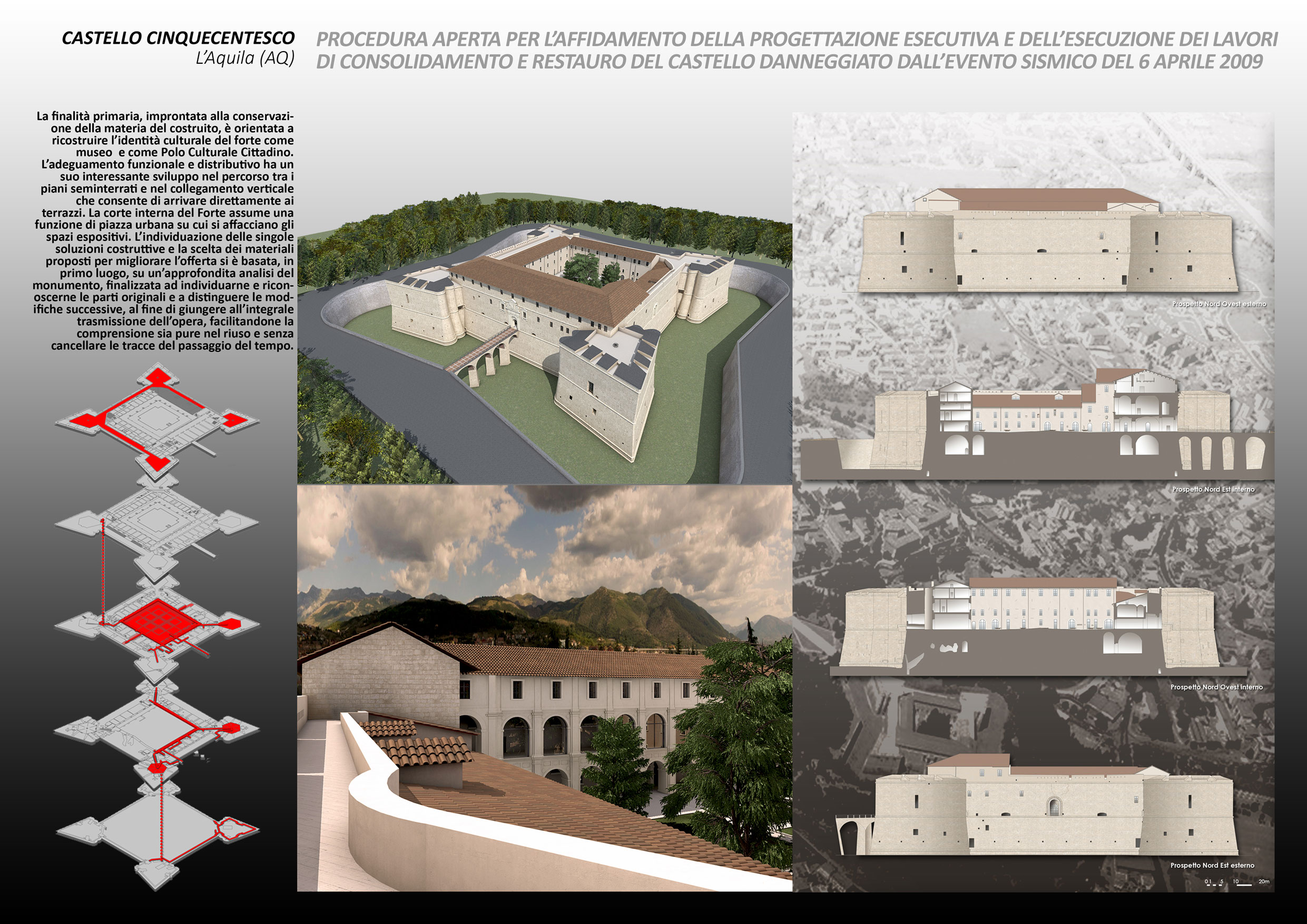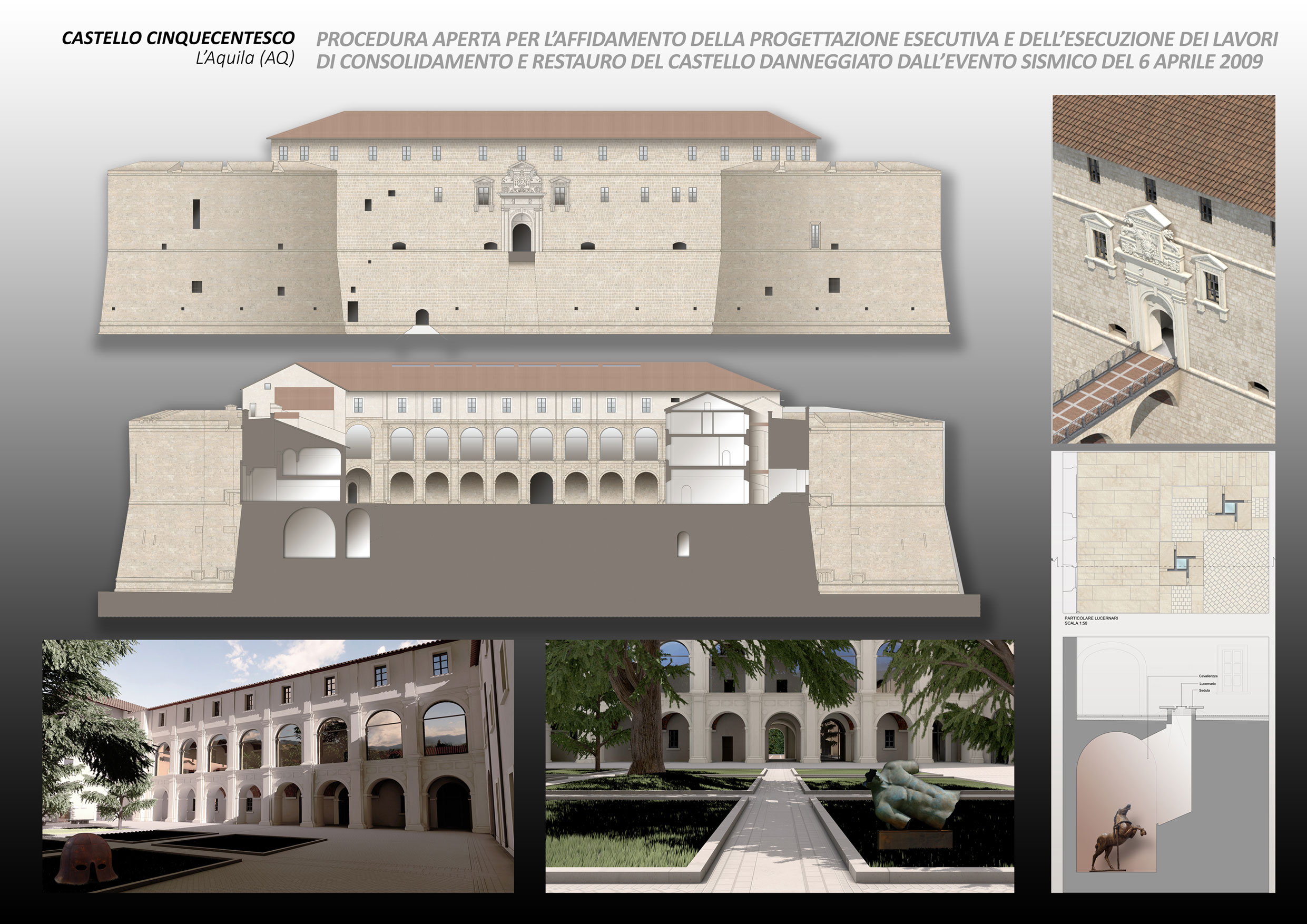Le opere comprendono i consolidamenti strutturali delle murature a seguito dei danni causati dal terremoto del 2009 e il restauro degli apparecchi murari e delle finiture interne compresa la predisposizione delle opere impiantistiche.