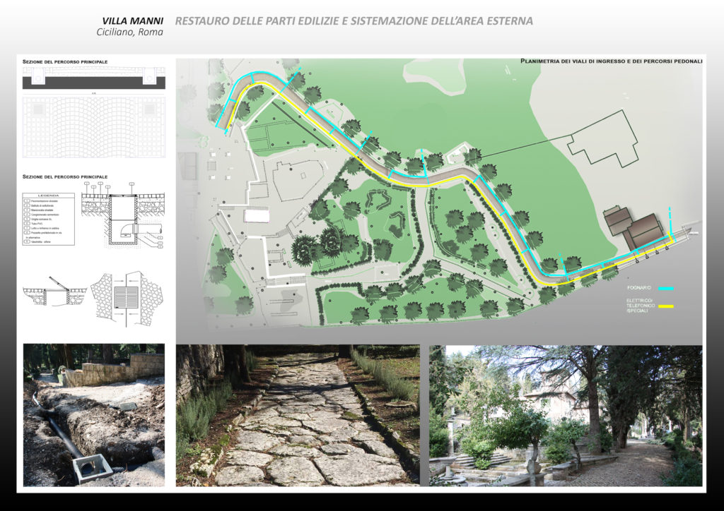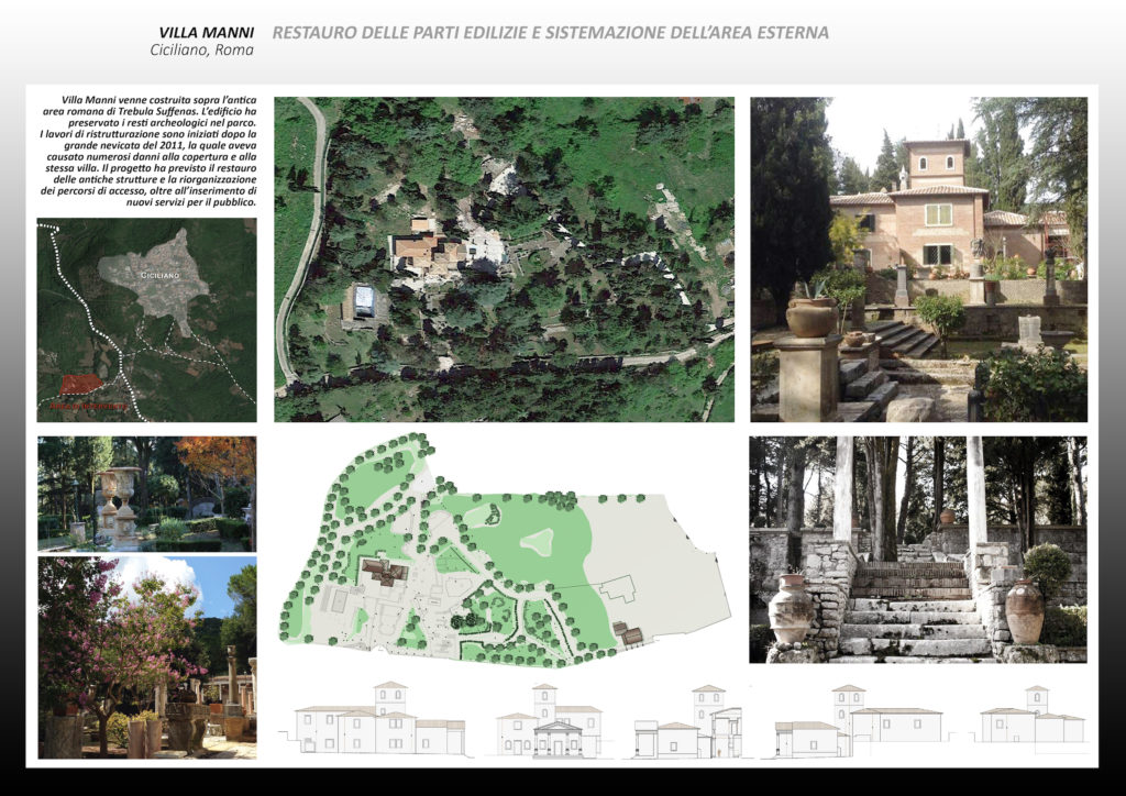 La Villa Manni, nel Comune di Ciciliano (RM), insiste sull’area dell’antica Trebula Suffenas, città divenuta municipio romano, di cui sono conservati pregevoli resti di edifici e testimonianze proprio all’interno del Parco.I lavori sono stati avviati a seguito dei danni provocati dalle straordinate nevicate dell’inverno 2011, danni che hanno reso necessario il restauro delle parti edilizie e del parco con il rifacimento delle coperture, il restauro dei manufatti e la sistemazione del viale d’accesso e delle alberature.