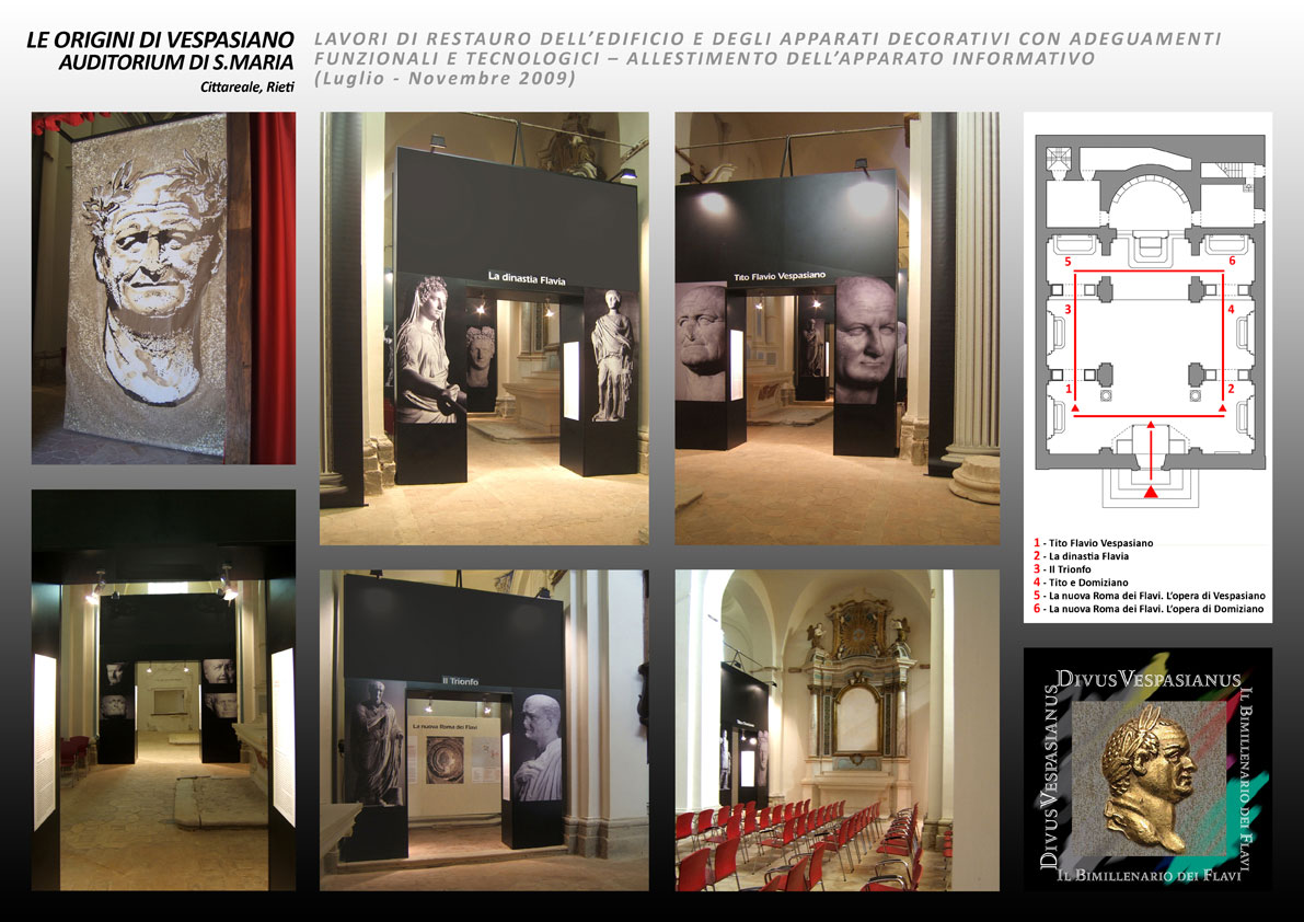 La mostra, organizzata in occasione delle celebrazioni del Bimillenario Vespasianeo, è stata allestita all’interno della chiesa/auditorium di S. Maria. Per consentire l’evento sono stati realizzati anche i lavori di restauro dell’edifico e degli apparati decorativi compresa l’installazione dell’apparato d’illuminazione. La struttura espositiva, pensata nel rispetto della completa percezione visiva degli elementi architettonici, è costituita da quattro grandi portali autoportanti realizzati in tubolare metallico rivestito e tre fondali che consentono di illustrare le vicende dei Flavi dalle origini al potere, mediante gigantografie e pannelli descrittivi.