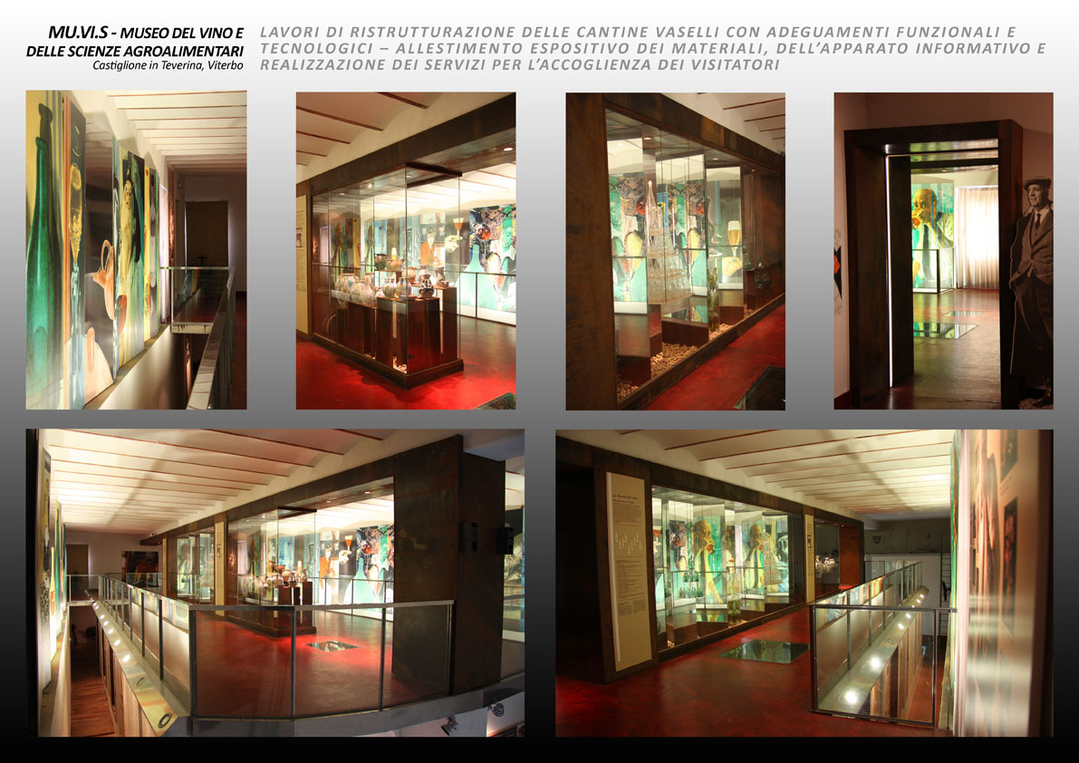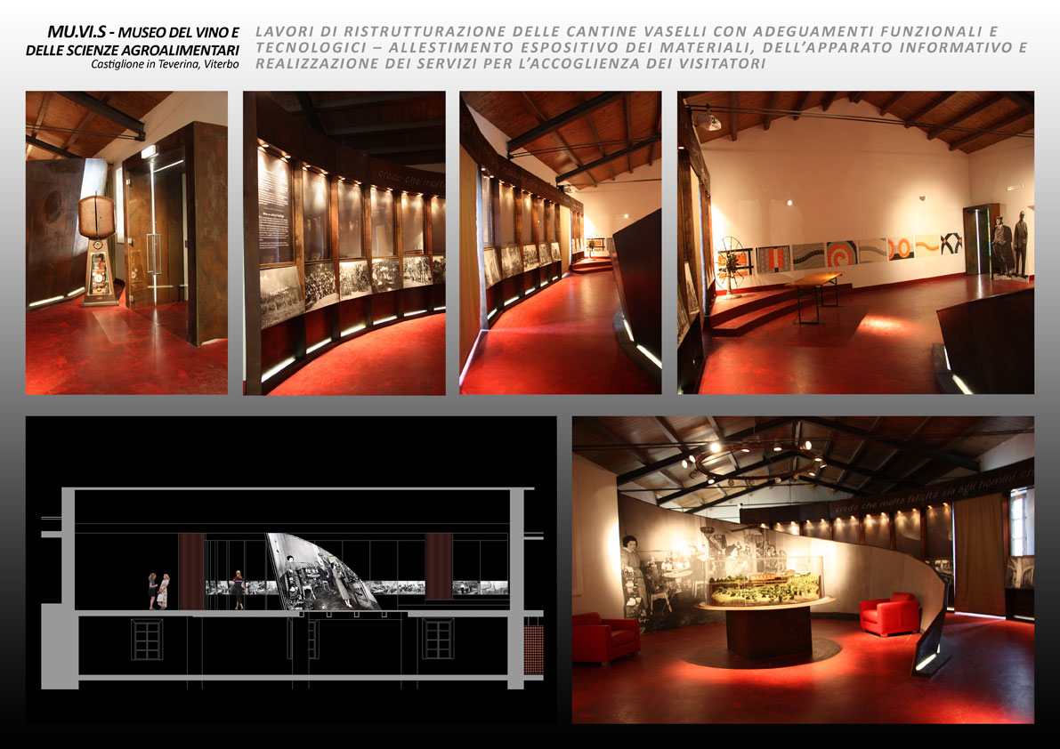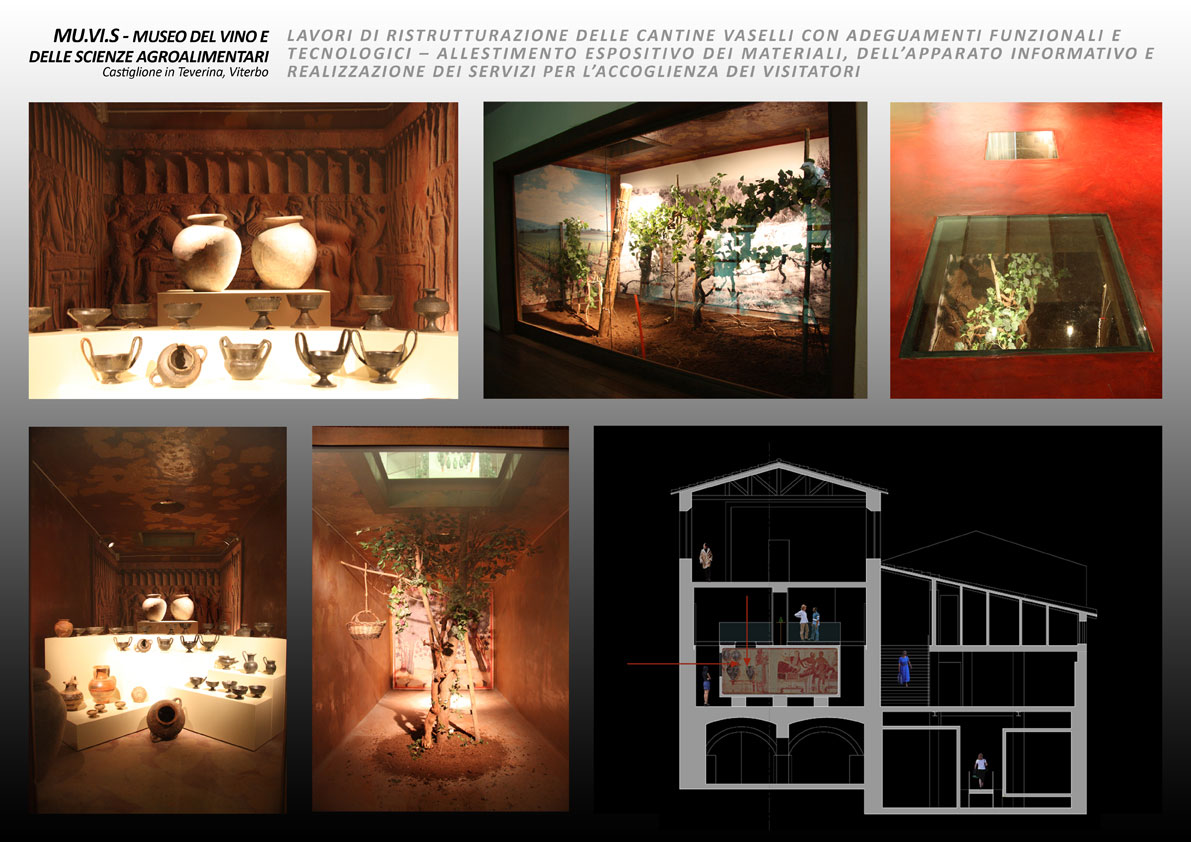 Il Museo del Vino di Castiglione, nell’avere una funzione documentativa sul tema del vino, si pone come percorso multicomunicativo e multisensoriale per catturare interesse e stimolare curiosità in una esperienza completa. L’allestimento, articolato su vari livelli a scendere, dalla superficie alla profondità, come per approfondire la consapevolezza dell’argomento, si avvale dell’applicazione di componenti e linguaggi diversi: architettura, grafica, video, suoni e luci per un pieno coinvolgimento del visitatore. Accanto alle tracce materiali e immateriali del mondo contadino (strumenti, foto, citazioni) e delle vicende storiche ed umane delle Cantine Vaselli (con video, gigantografie e macchinari) sono stati “messi in scena” con installazioni teatrali o grafiche, gli aspetti della produzione e della tradizione vinaria nel territorio della Teverina, sul piano locale, accanto ai grandi temi di più ampio respiro culturale. Collegati direttamente al percorso museale dall’interno, ci sono spazi dedicati a degustazione ed eventi che si aprono anche direttamente all’esterno proprio per favorire il loro autonomo funzionamento indi-pendentemente da quello del museo. L’intervento di recupero, finalizzato alla creazione di un Centro Culturale, ha coinvolto il vasto ed articolato complesso edilizio produttivo dei Conti Vaselli, situato nel cuore del borgo di Castiglione in Teverina, che era costituito da una grande Cantina distribuita su 6 piani (1° piano, piano terra e 4 piani sotterranei), non più in uso da quasi 15 anni, ora sede del museo; di un ex oleificio destinato a Centro Didattico e di un ex acetificio in cui è stato realizzato un Centro Visite. Il Museo, che è costituito da un lungo e complesso percorso espositivo che si sviluppa all’interno dell’edificio principale, comprende anche infrastrutture e servizi per l’accoglienza dei visitatori e il potenziamento dell’offerta culturale come l’enoteca, lo spazio per mostre temporanee e la sala  conferenze-auditorium.  Il progetto di valorizzazione, attuato per interventi consecutivi, si estende anche al grande spazio su cui affacciano gli edifici, con sistemazioni destinato ad ospitare eventi all’aperto.