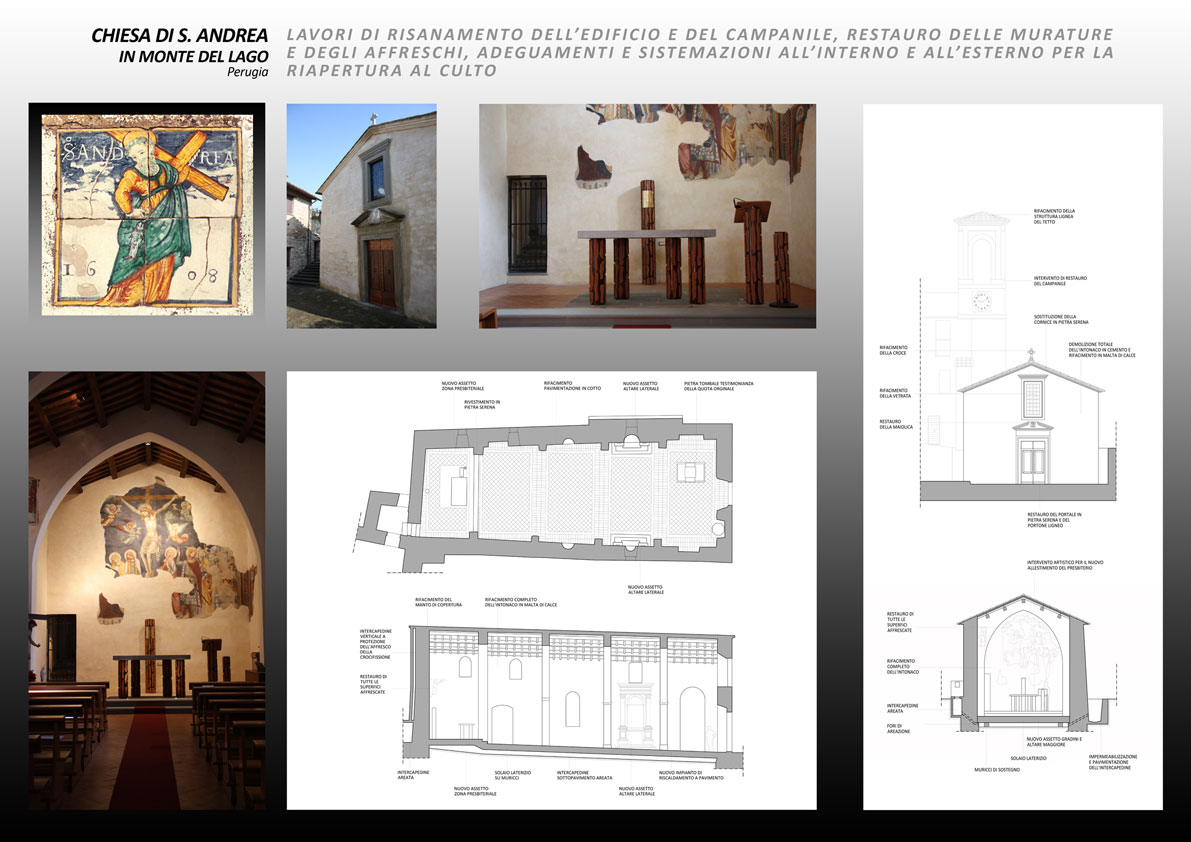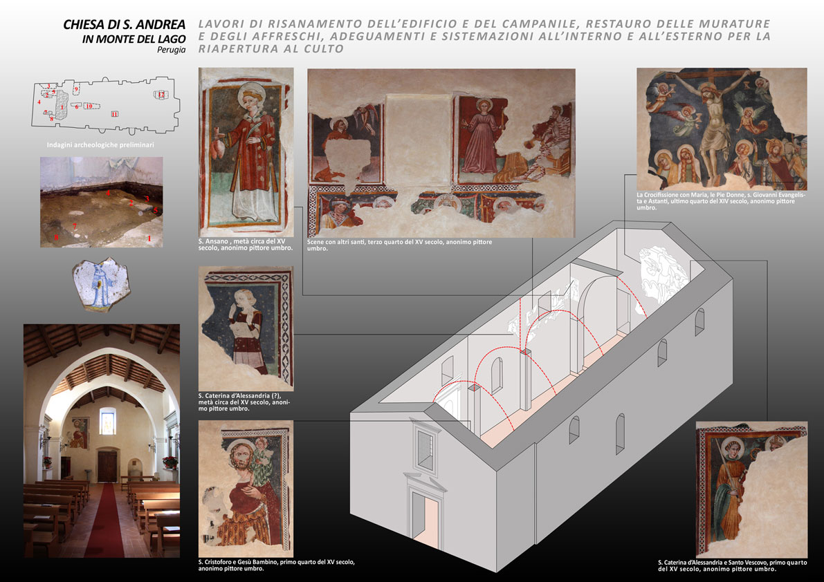 Il restauro conservativo della Chiesa di S.Andrea, parrocchiale di Monte del Lago, ha avuto inizio nel 1990 con il risanamento del tetto, la formazione delle due intercapedini perimetrali e il rifacimento della pavimentazione dello spazio antistante. Sono seguiti quindi, dal 1994, i lavori di bonifica delle murature perimetrali e del piano di calpestio interno per eliminare i danni dovuti alla forte umidità che poneva in serio pericolo il prezioso ciclo di affreschi. Nel 2006 sono state restaurate le facciate esterne e il campanile; a seguire, sono state realizzate le opere di riassetto e sistemazione dello spazio interno e il restauro conservativo delle superfici affrescate che ha coronato l’intervento nel 2009, consentendo la riapertura della chiesa al culto. Date le condizioni di degrado, dovute principalmente alla presenza della forte umidità, che rendevano impossibile il normale uso dell’edificio, l’intervento ha avuto come obiettivo principale il risanamento delle murature e la restituzione della salubrità all’interno dell’edificio. Nel rispetto degli attuali criteri ed indirizzi del restauro dei monumenti, pur conservando la sua complessiva ”autenticità”, si è voluto restituire all’edificio la percezione dello spazio e dell’apparato decorativo originale, salvando ogni testimonianza, eccetto aggiunte ritenute incongrue.